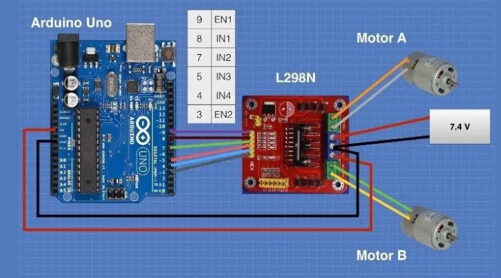 หมายเหตุ: คุณไม่ได้แนบแผนภาพที่อ้างถึง ดังนั้นฉันจะอธิบายการเชื่อมต่อทั่วไปที่ใช้กับ Arduino Uno และ L298N: