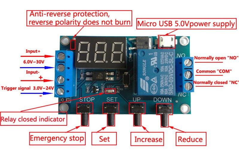 โมดูลรีเลย์แบบทางเดียว หน่วงเวลาปิดและตัดการทำงาน หน่วงเวลาเป็นรอบ วงจรจับเวลาสวิตช์ ปรับได้ต่อเนื่องตั้งแต่ 0.1 วินาที (ต่ำสุด) ถึง 999 นาที (สูงสุด)
