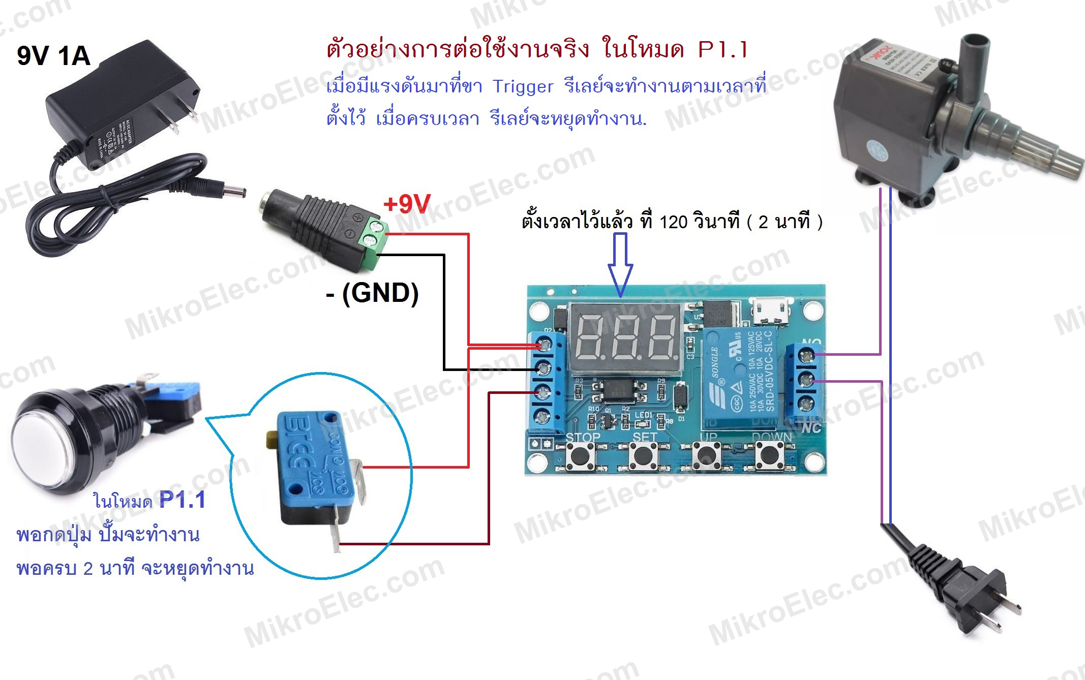 P3.1: หลังจากให้สัญญาณกระตุ้น รีเลย์จะเปิดเป็นเวลา OP รีเลย์จะถูกตัดการเชื่อมต่อเป็นเวลา CL จากนั้นจะทำการวนซ้ำการกระทำข้างต้น หากมีการให้สัญญาณอีกครั้งในระหว่างวงจร รีเลย์จะถูกตัดการเชื่อมต่อและการจับเวลาจะหยุดลง สามารถตั้งค่าจำนวนรอบ (LOP) ได้