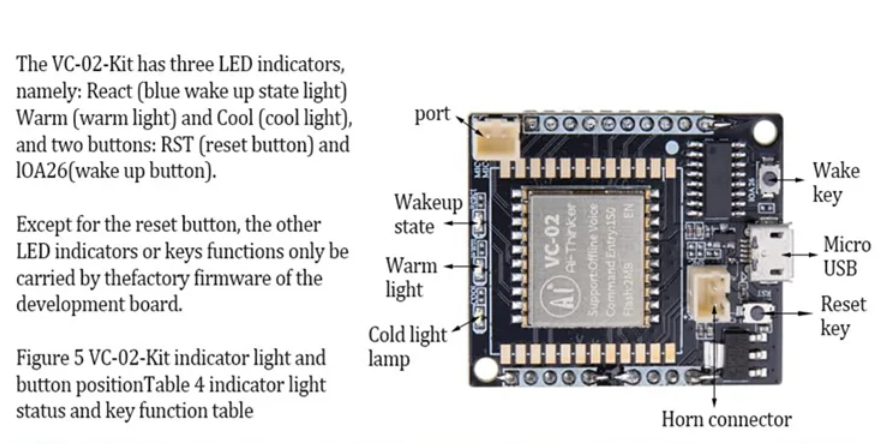 Ai-Thinker VC-02 Kit Voice Recognition Board The Ai-Thinker VC-02 Kit Voice Recognition Board is a development board designed for the VC-02 module, and it is a shared the same board with the VC-01-Kit. The development board integrates the CH340C serial port to a USB chip, providing a basic debugging interface and USB upgrade interface, designing wake-up light and cold and cooling lamp, providing status indication and control instructions, and easy to debug the simple control function. VC-02 is a low-cost pure offline speech recognition module.