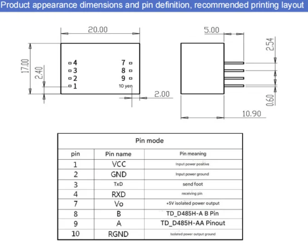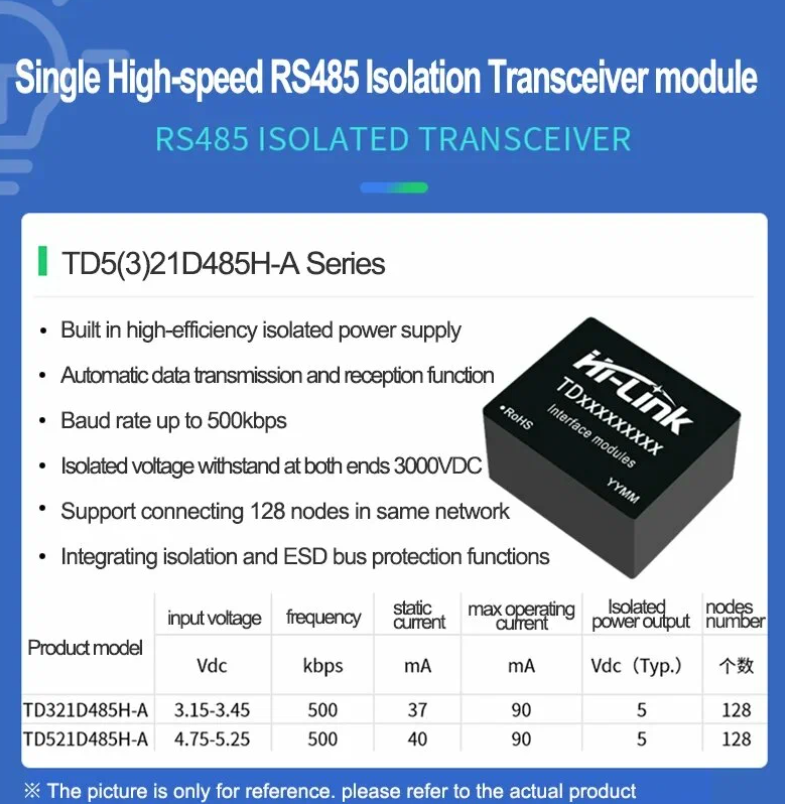 D321D485H-A/ TD521D485H-A,the main function is to convert logical levels into differential levels of RS485 protocol, achieve signal isolation, and is an RS485 protocol transceiver module that uses IC integration technology to achieve power isolation, signal isolation, RS485 communication, and bus protection.