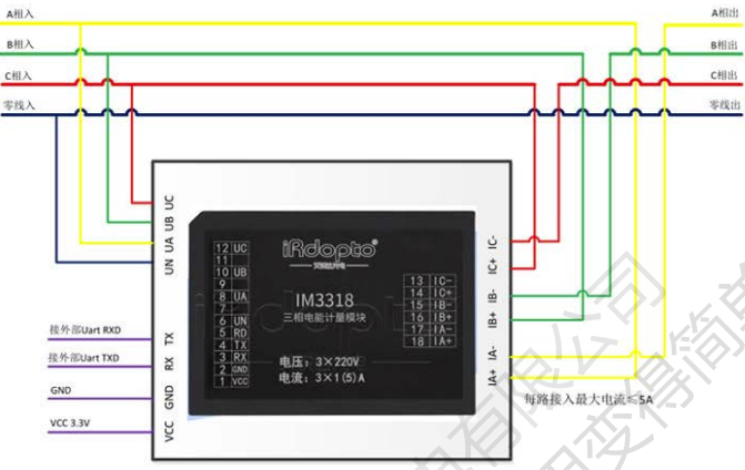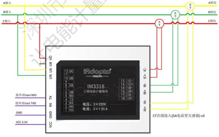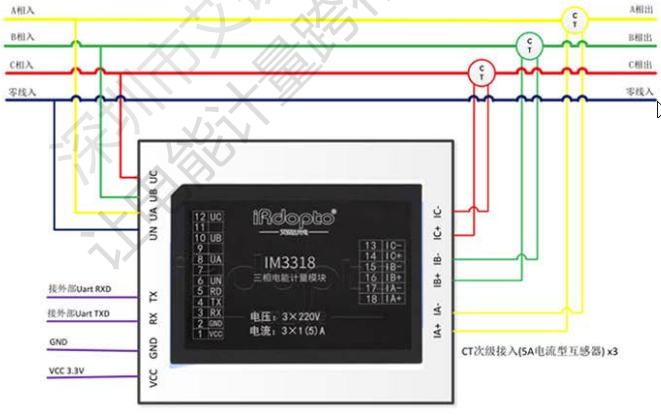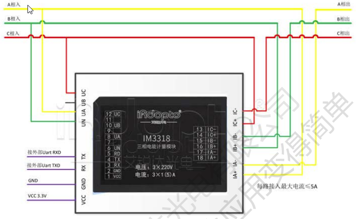 | 17 | IA- | Input | Current channel Phase A negative current signal input terminal, port Imax 5A. Recommended circuit: Connect CT with ratio of 1000A/5A or below according to user load |